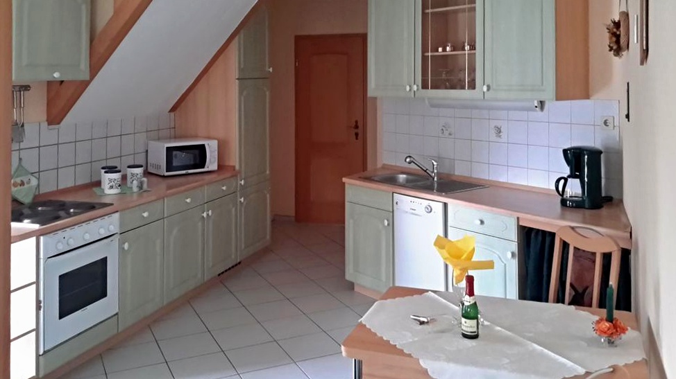 Natürlich gibt es auch Kaffeemaschine, Wasserkocher und Toaster. Besteck, Töpfe, Pfannen und Schüsseln finden Sie ebenfalls vor.