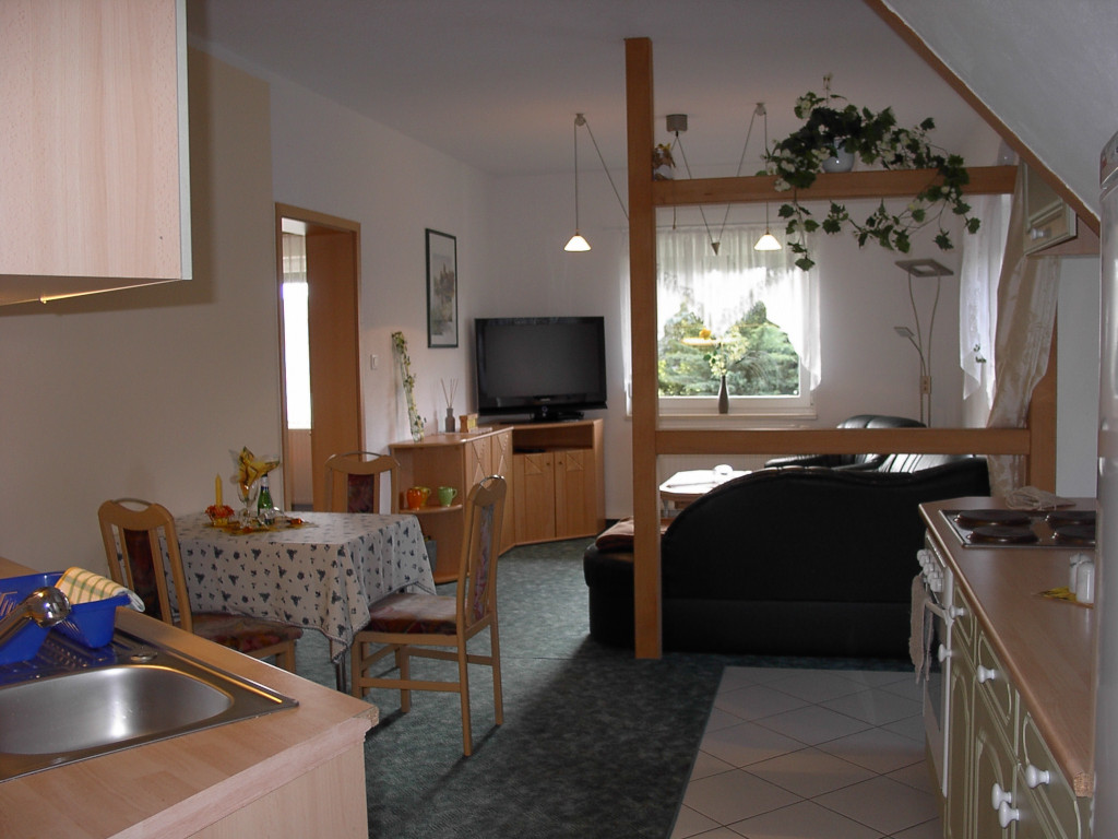 Wir wünschen uns, dass Sie sich wohlfühlen. Neben Couch, Sessel und einer Eßecke ist der Wohnbereich mit TV, SAT, W-LAN und Radio ausgestattet.