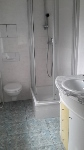 Das Bad besitzt ein Fenster und ist mit WC, Dusche und Waschbecken ausgestattet.